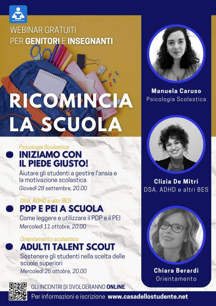 Con l’inizio della scuola, Casa dello Studente propone tre webinar dedicati a genitori e insegnanti che affronteranno i temi di ansia e motivazione scolastica, lettura di PDP e PEI e orientamento scolastico