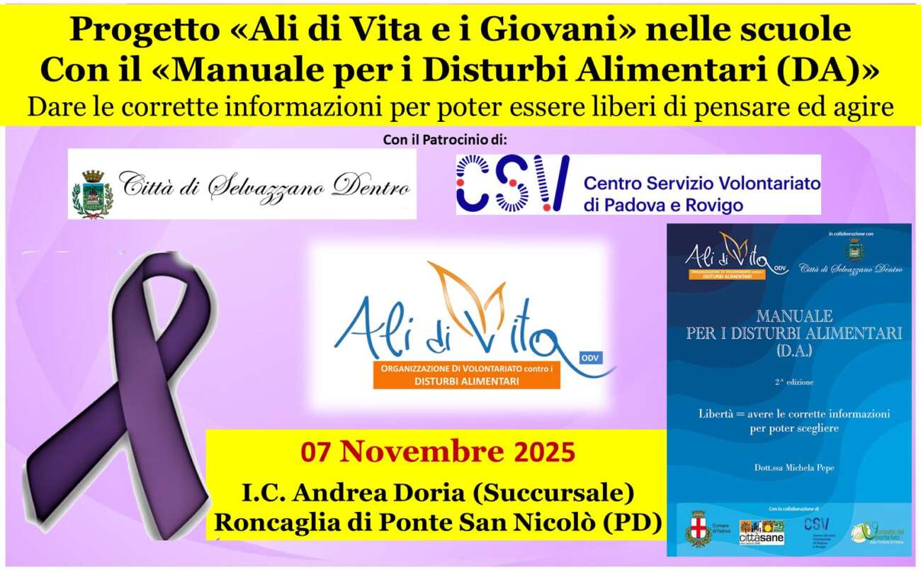 Giovedì 7 novembre presso l’I.C. Andrea Doria a Roncaglia di Ponte San Nicolò, l’associazione Ali di Vita sarà presente per il primo anno con il progetto di prevenzione sui Disturbi Alimentari: “Ali di Vita e i giovani”, appuntamenti che da molti anni sono svolti all’interno delle Scuole Medie inferiori con l’obiettivo di fornire ai giovani chiare e semplici informazioni con un linguaggio adeguato affinché possano comprendere cosa sono i Disturbi Alimentari, e a chi rivolgersi per chiedere chiarimenti o aiuto.