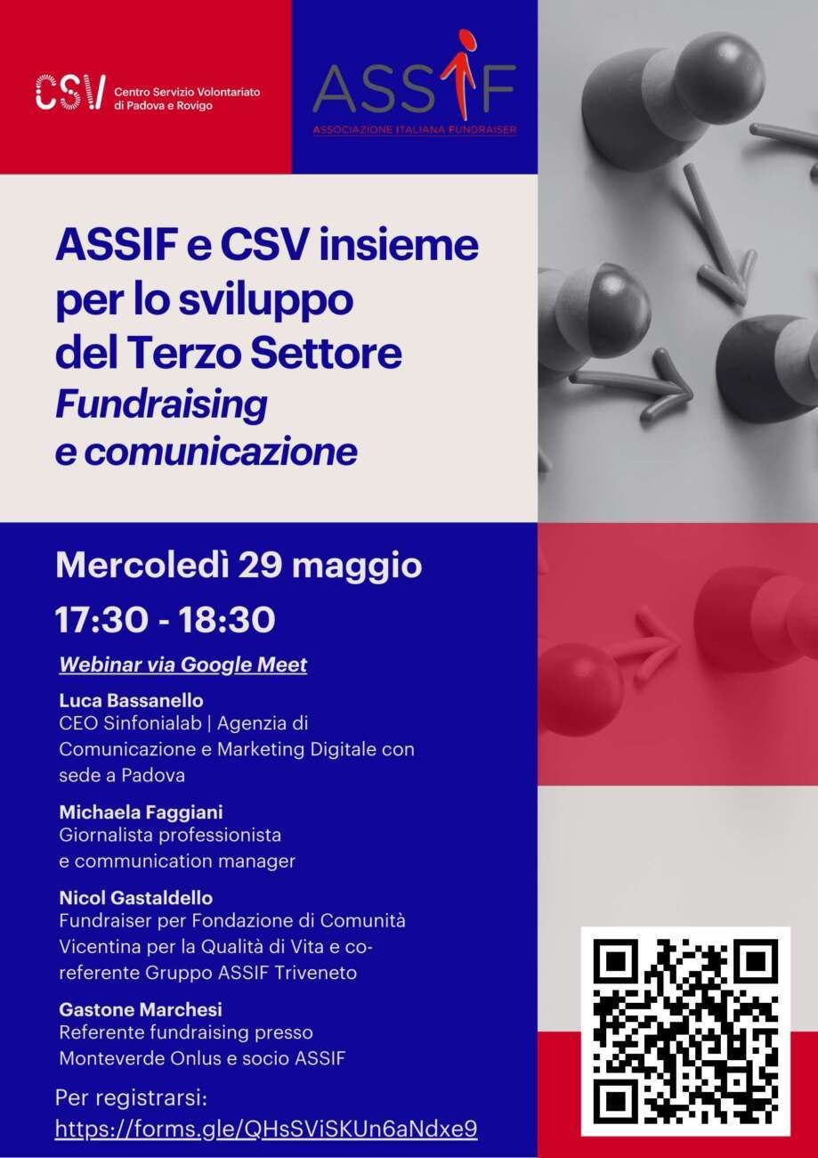 Mercoledì 29 maggio dalle 17.30 alle 18.30 si terrà il terzo webinar a cura del CSV di Padova e Rovigo e di ASSIF – Associazione Italiana Fundraiser per il ciclo “Assif e CSV insieme per lo sviluppo del Terzo settore”, incentrato sul tema del fundraising e della comunicazione.