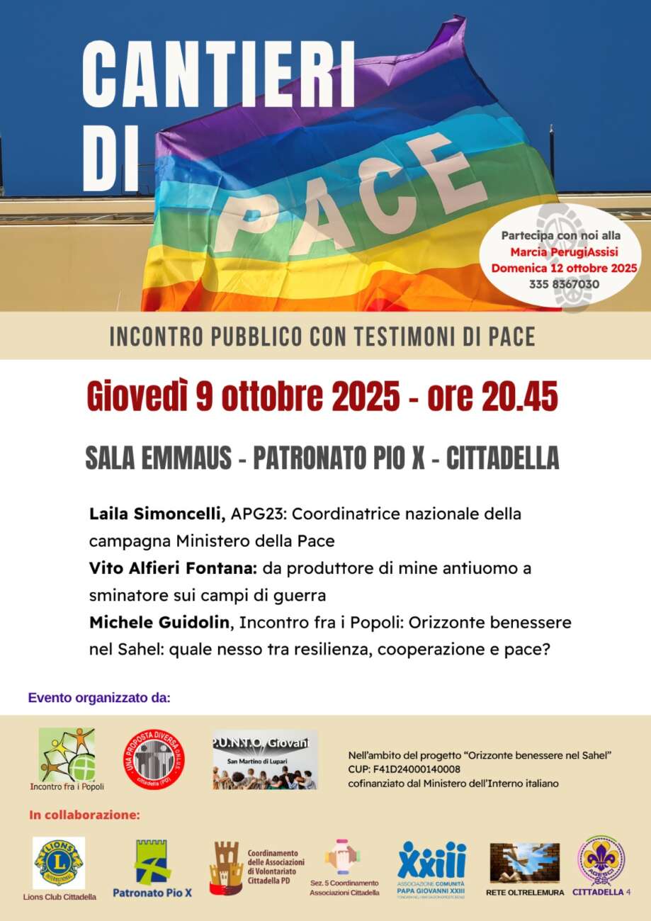 Giovedì 9 ottobre 2025 alle ore 20.45 la Sala Emmaus del Patronato Pio X di Cittadella ospiterà l’appuntamento “Cantieri di Pace”, un momento di confronto con testimoni diretti di percorsi di pace e giustizia.