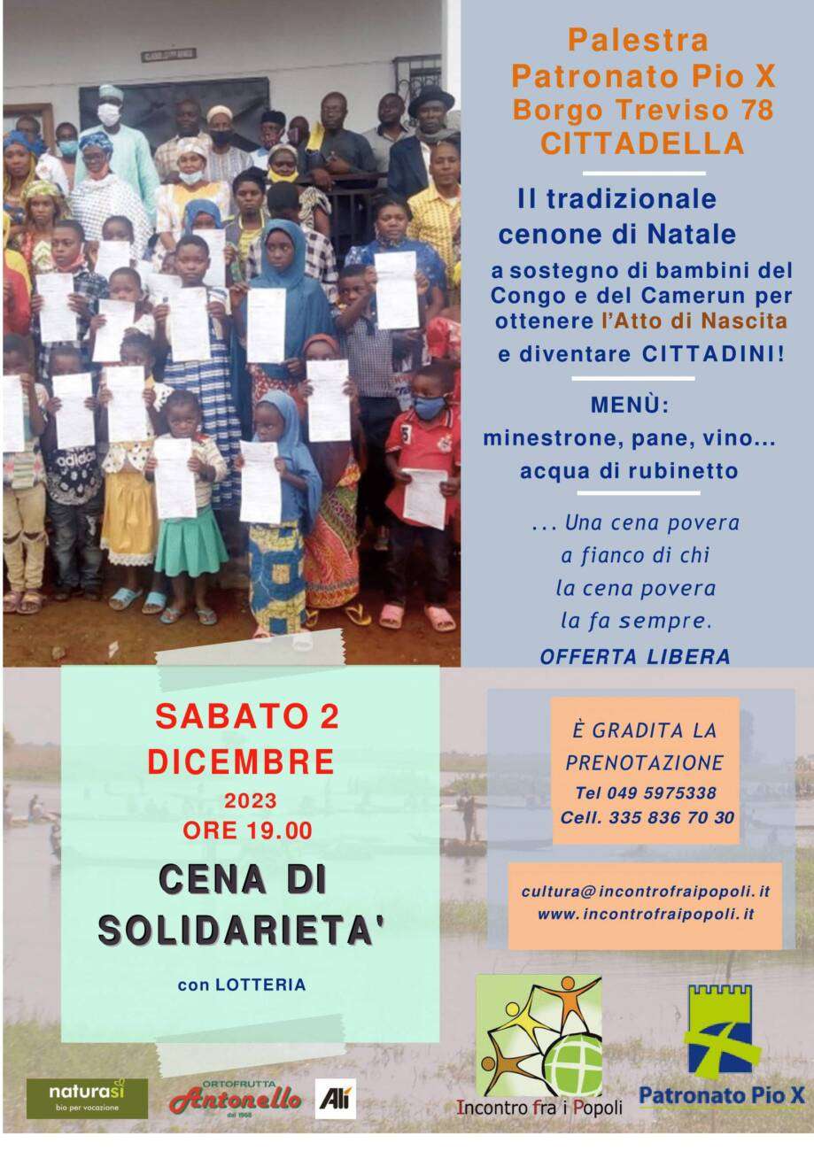 Per l’occasione si terrà il tradizionale cenone di Natale con lotteria a sostegno di bambini e bambine del Congo e del Camerun per ottenere l’Atto di Nascita e diventare cittadini.
