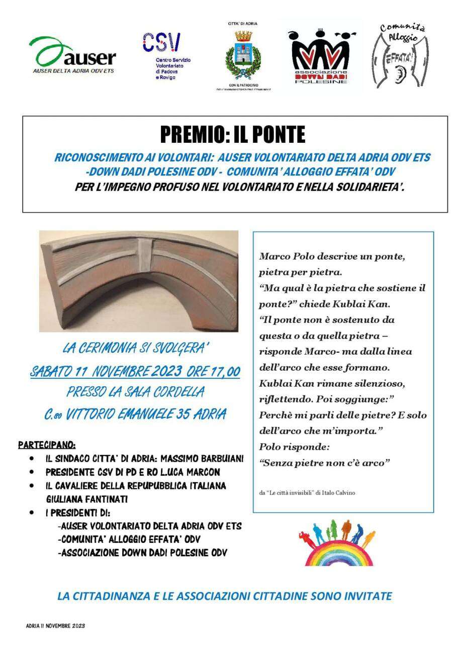 La cerimonia di consegna del premio si svolgerà sabato 11 novembre, alle ore 17.00, presso la Sala Cordella in Corso Vittorio Emanuele 35, Adria.