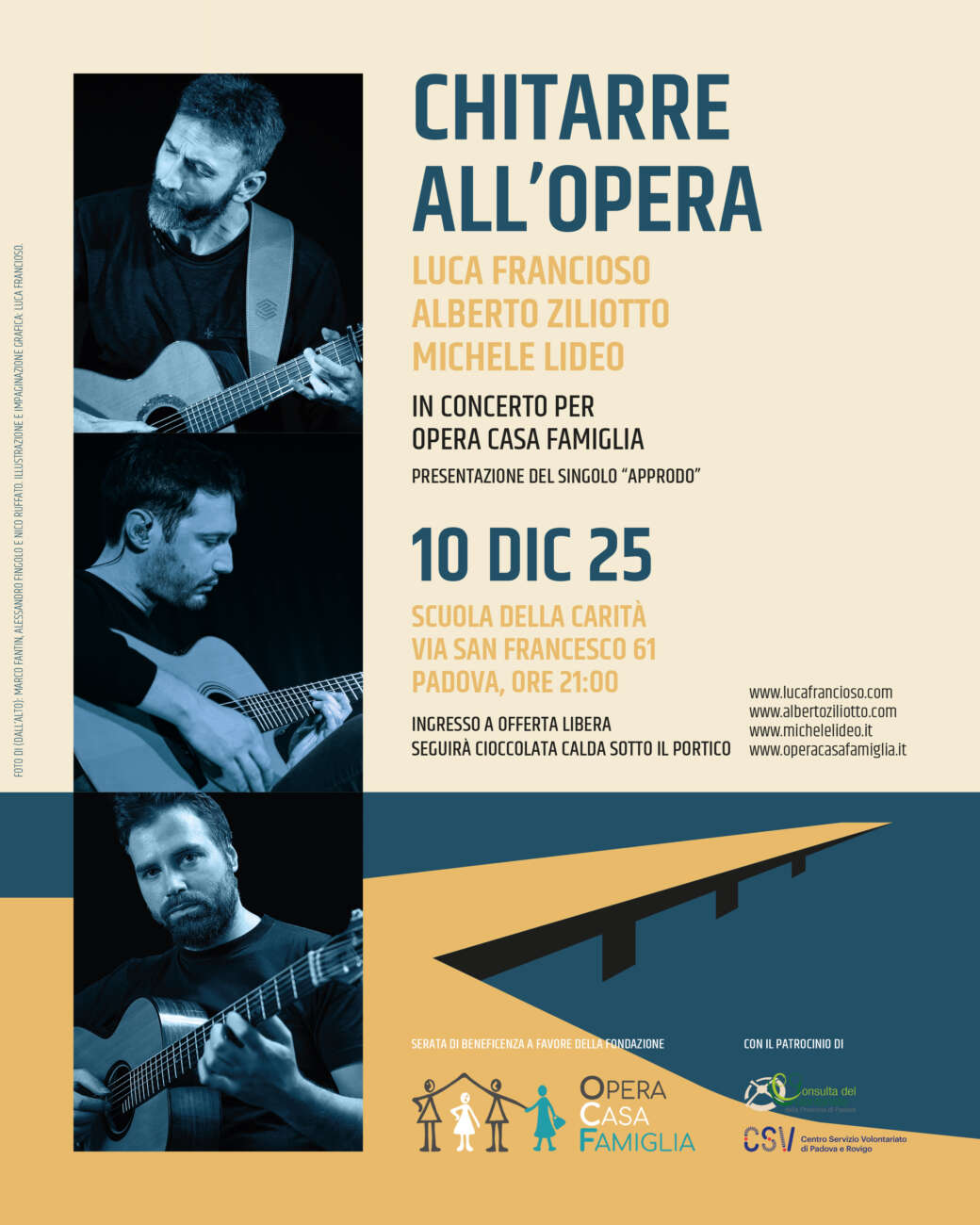 Il 10 dicembre 2025, alle ore 21.00, la Scuola della Carità di Padova (via San Francesco 61) ospiterà il concerto “Chitarre all’Opera”, un evento musicale a favore di Opera Casa Famiglia, organizzazione che da anni sostiene persone in difficoltà.