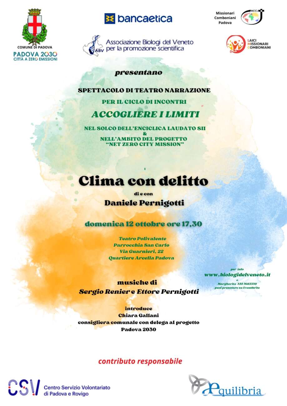 Domenica 12 ottobre, alle ore 17.30, al Teatro Polivalente della Parrocchia San Carlo (via Guarnieri 22, quartiere Arcella – Padova), va in scena “Clima con delitto”, spettacolo di teatro narrazione con le musiche di Sergio Renier ed Ettore. L’incontro sarà introdotto da Chiara Gallani, consigliera comunale con delega al progetto Padova 2030.