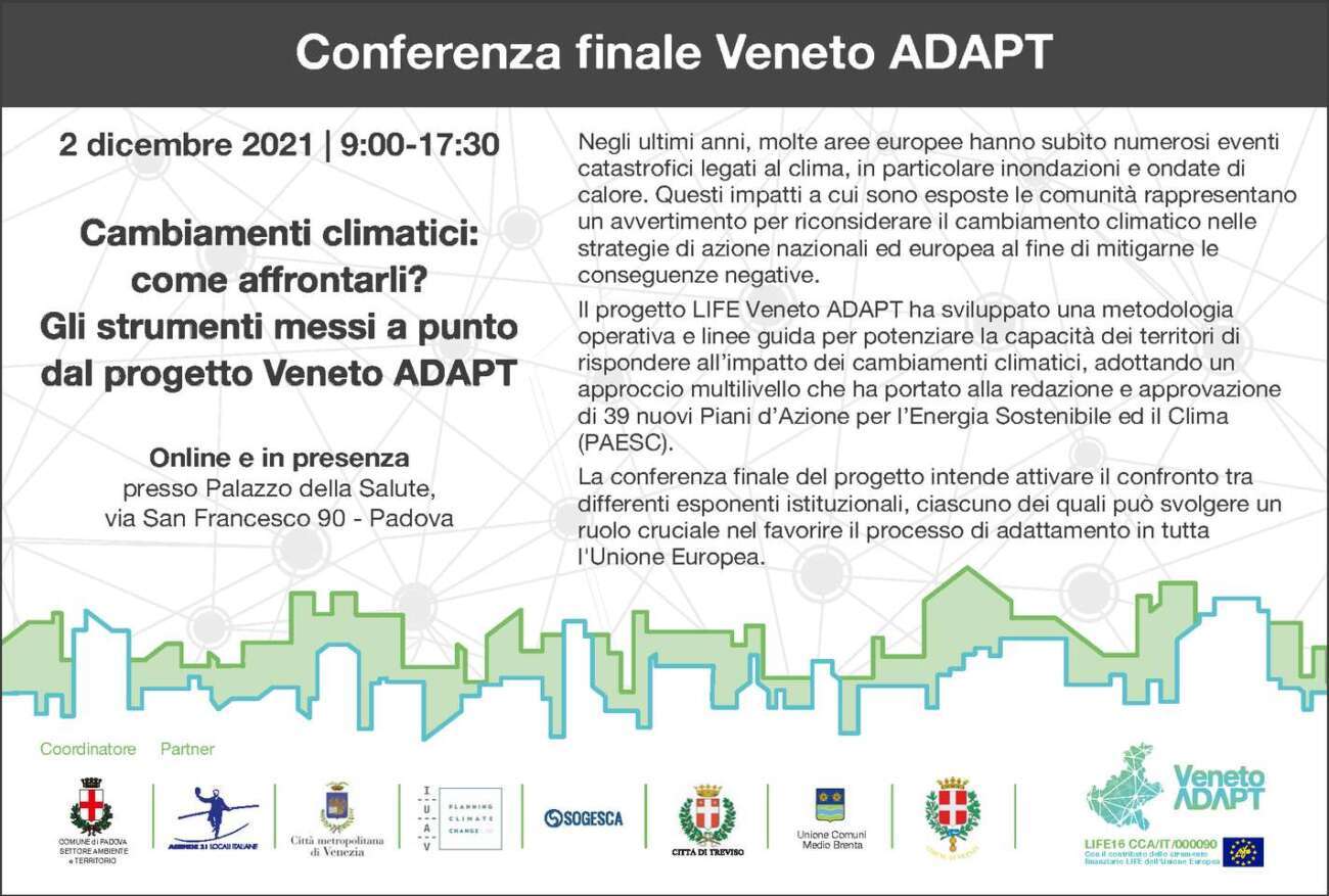Giovedì 2 dicembre 2021 dalle 9.00 alle 17.30 sia online che in presenza presso Palazzo della Salute, Via San Francesco n. 90 a Padova si terrà la conferenza “Cambiamenti climatici: come affrontarli? Gli strumenti messi a punto dal progetto Veneto ADAPT”