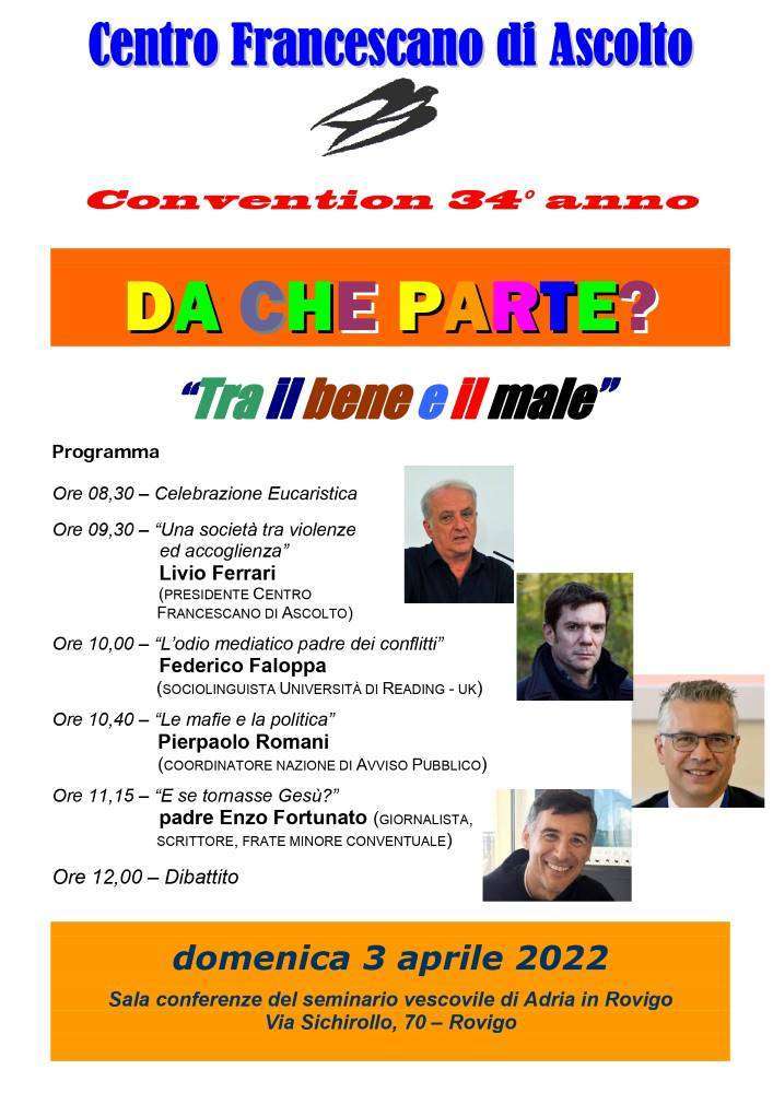 34^ Convention del Centro Francescano di Ascolto che si tiene domenica 3 aprile, presso la Sala Conferenze del Seminario Vescovile di Adria-Rovigo – via Sichirollo n. 70 – a Rovigo, dal titolo “Da che parte? Tra il bene ed il male”.