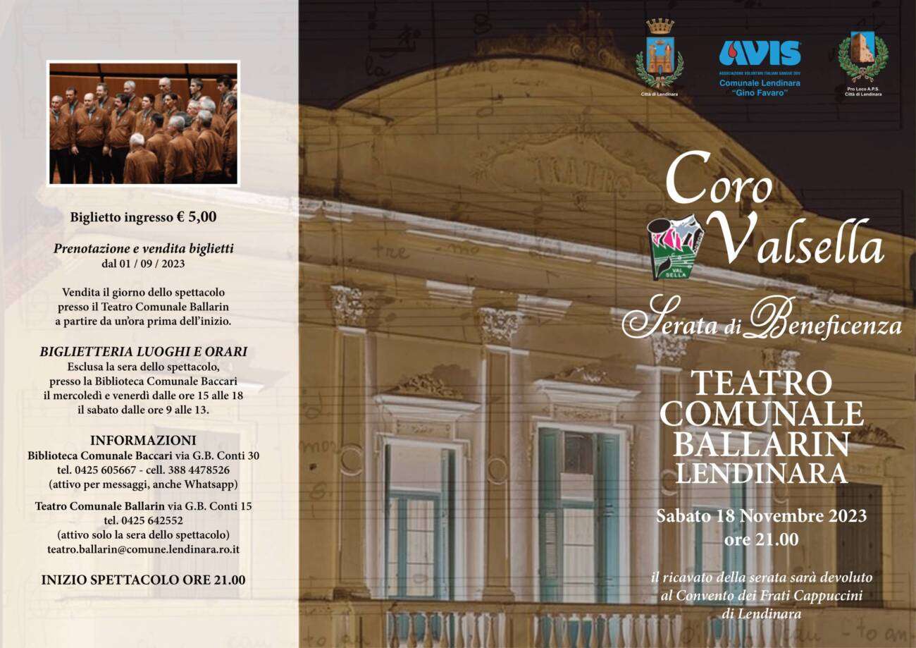 Sabato 18 novembre, alle ore 21, presso il Teatro Comunale Ballarin di Lendinara, si terrà il Concerto di beneficenza tenuto dal Coro Valsella di Borgo Valsugana. Il coro si esibirà con canti tipici di Montagna Trentina.