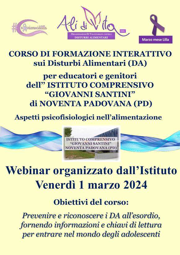 Ali di Vita ha organizzato un Corso di formazione interattivo sui Disturbi Alimentari (DA) per educatori e genitori dell’Istituto Comprensivo “Giovanni Santini” di Noventa Padovana, in occasione della Giornata Nazionale del Fiocchetto Lilla