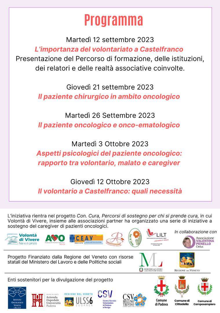 L’iniziativa rientra nel progetto “CON.CURA”, Percorsi di sostegno per chi si prende cura, finanziato dalla Regione del Veneto con fondi statali del Ministero del lavoro e delle politiche sociali, di cui l’Associazione Volontà di Vivere è ente capofila ed affiancata in partenariato da alcune associazioni del territorio. Per il corso di formazione si avvale della collaborazione dell’Associazione Lilt di Treviso.