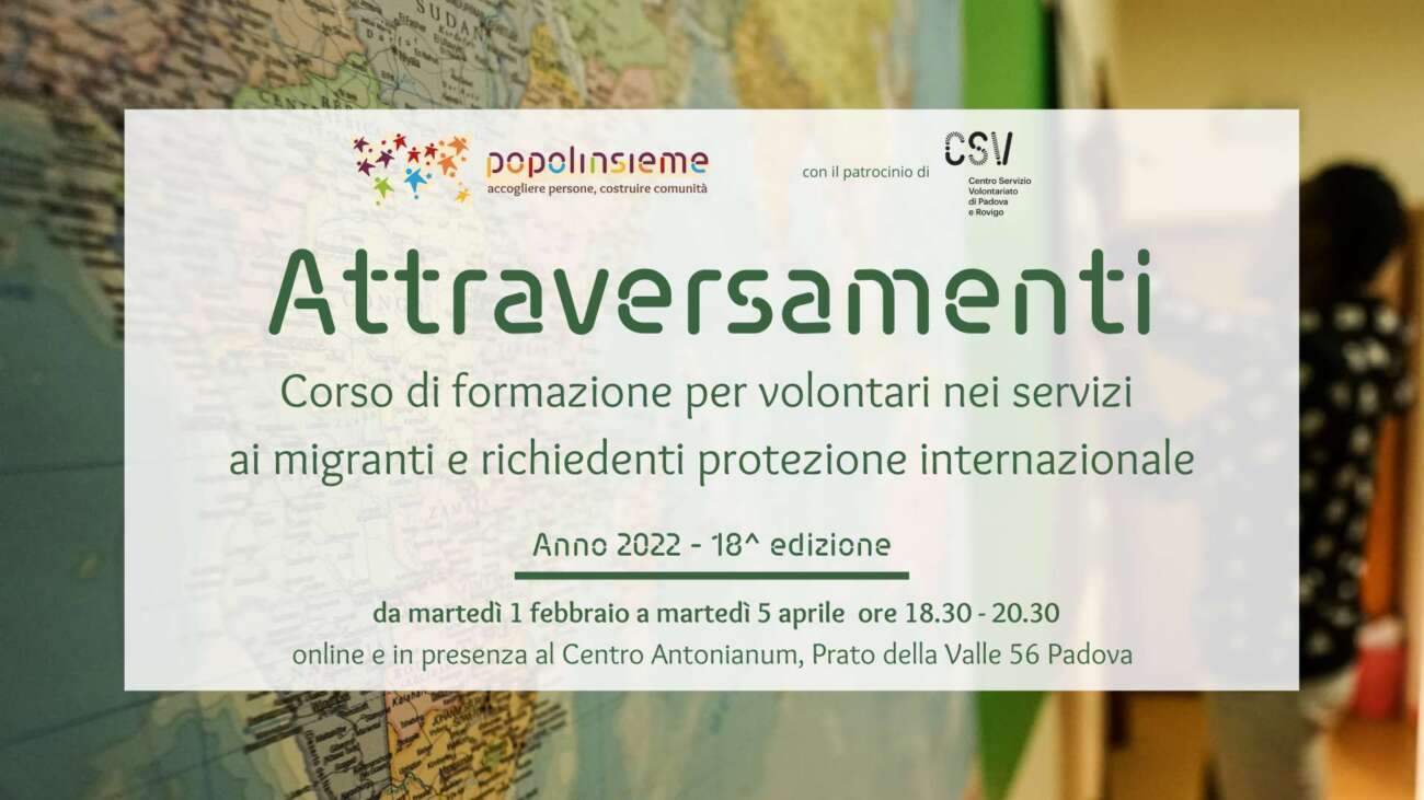 Iscrizione in presenza: https://sostieni.popolinsieme.eu/eventi/attraversamenti-corso-di-formazione-per-volontari/