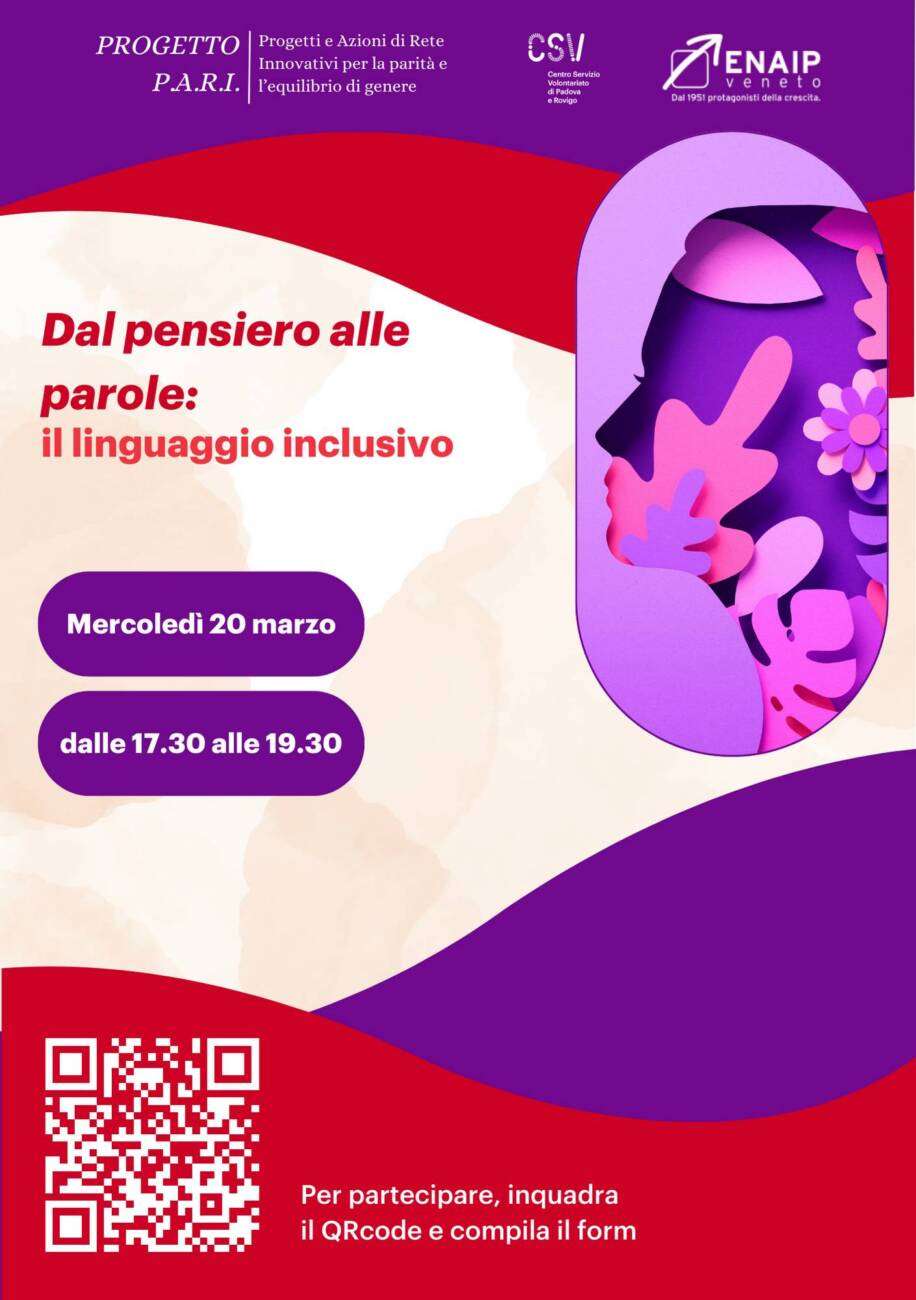 Nel contesto del progetto P.A.R.I. – Progetti e Azioni di Rete Innovativi per la parità e l’equilibrio di genere, è stato organizzato il webinar “Dal pensiero alle parole: il linguaggio inclusivo“.