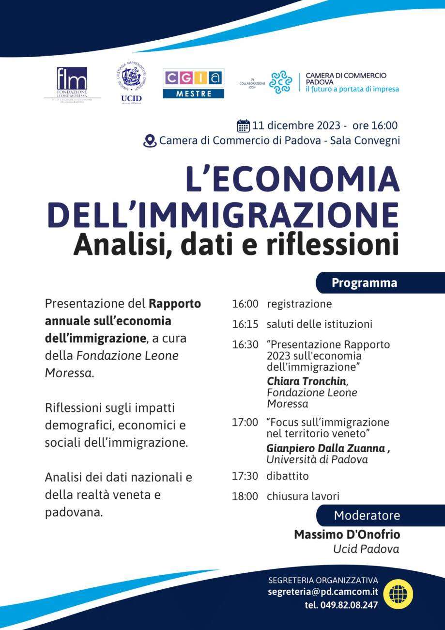Fondazione Leone Moressa, Unione Cristiana Imprenditori Dirigenti e Associazione Artigiani e Piccole Imprese Mestre organizzano l’incontro “L’Economia dell’Immigrazione. Analisi, dati e riflessioni”