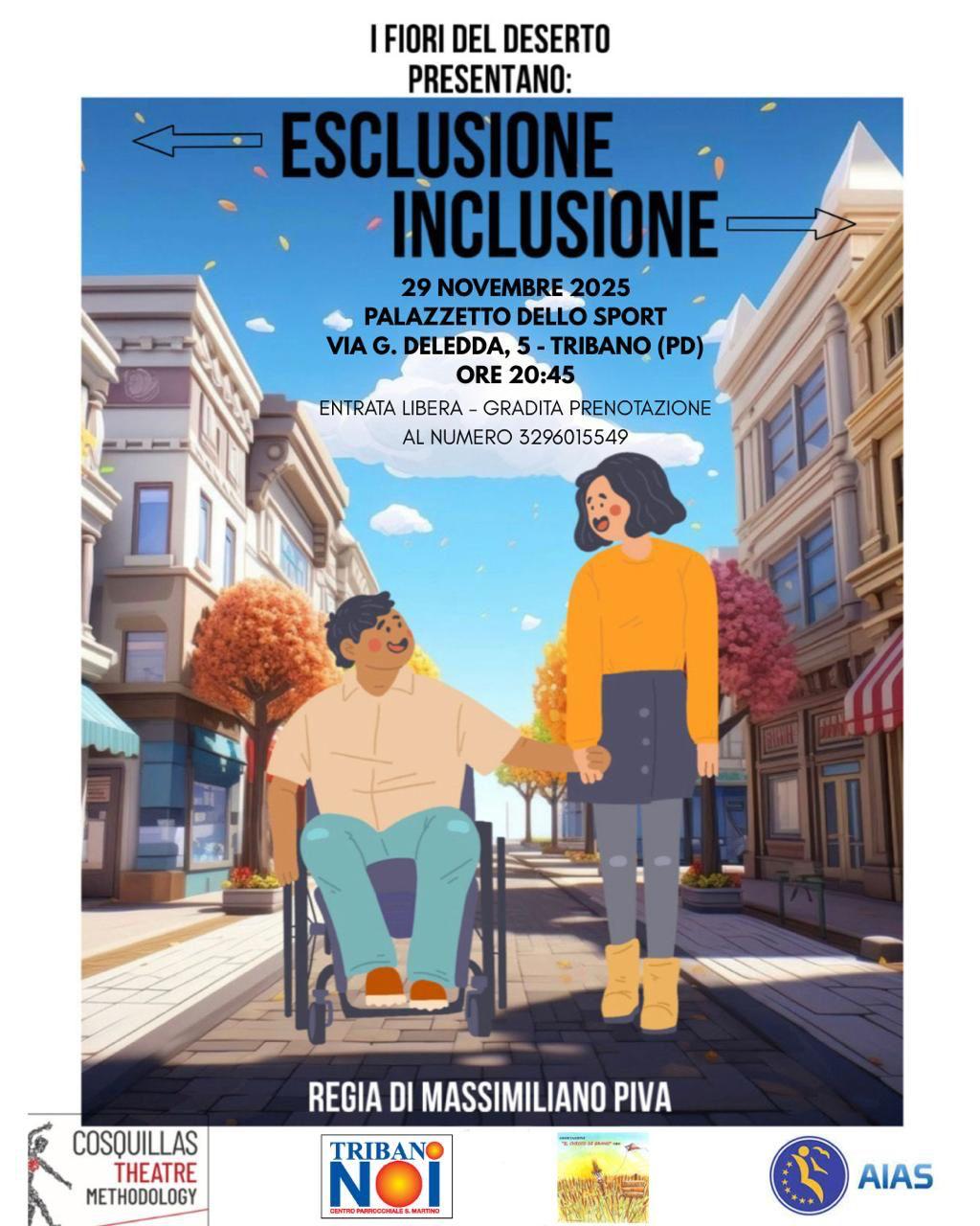 Il 29 novembre 2025, alle ore 20.45, il Palazzetto dello Sport di Tribano aprirà le sue porte a “Esclusione Inclusione”, una performance teatrale che porta in scena il valore dell’incontro, dell’ascolto e della condivisione. L’evento, a ingresso libero e promosso dal Circolo Noi di Tribano in collaborazione con l’Associazione Il Chicco di grano ODV, nasce dalla preziosa esperienza teatrale dell’A.I.A.S. di Ferrara e del gruppo “I fiori del deserto”, sotto la regia di Massimiliano Piva.