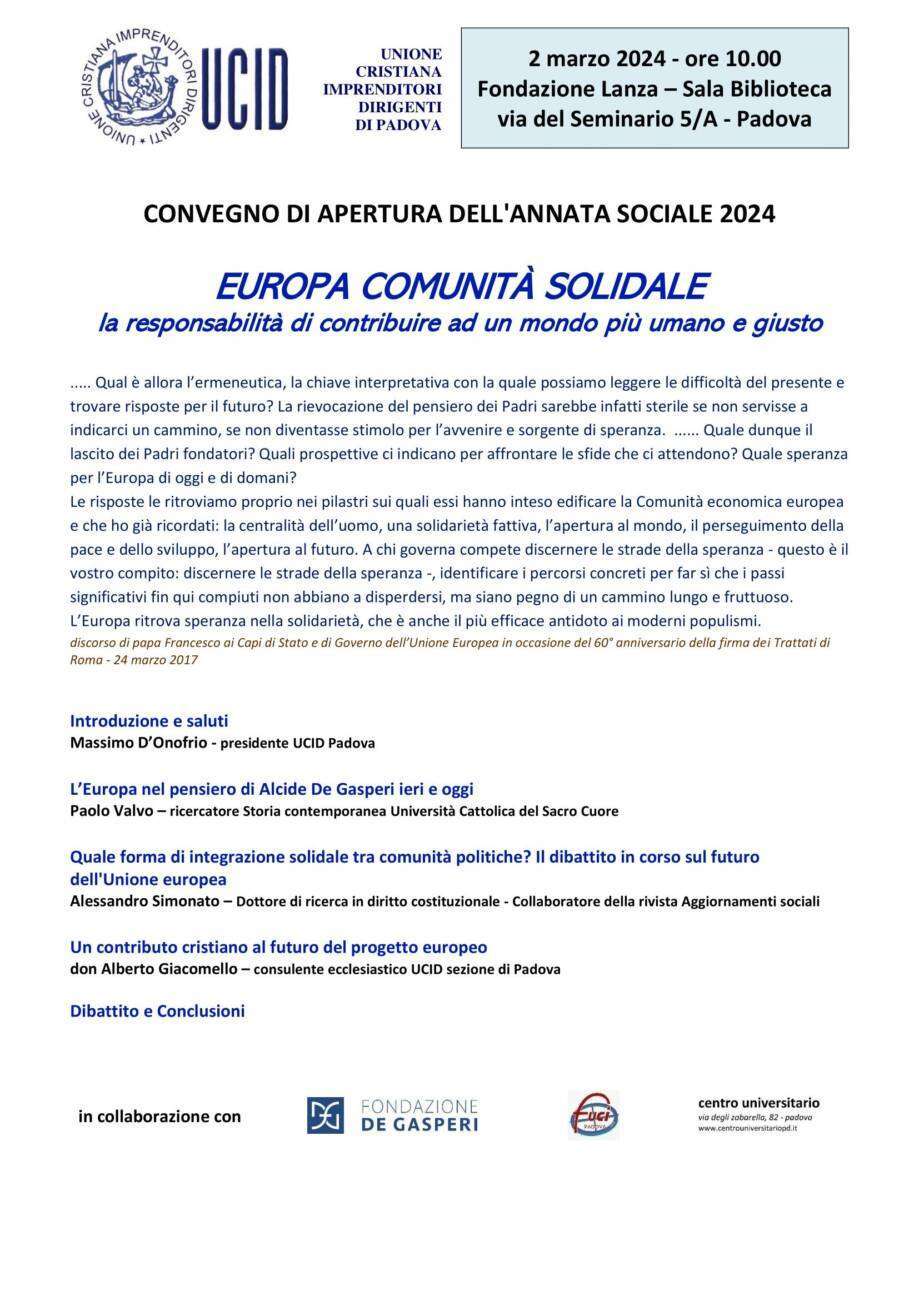 UCID Sezione di Padova invita a partecipare al convegno “Europa Comunità Solidale”