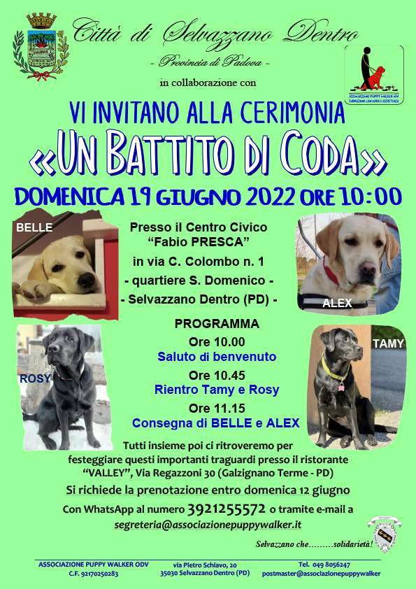 L’associazione Puppy Walker è lieta di invitare la cittadinanza alla consegna ufficiale di due cani guida che proprio in questi giorni stanno ultimando la loro formazione per diventare il fedele compagno di vita di due persone non vedenti.