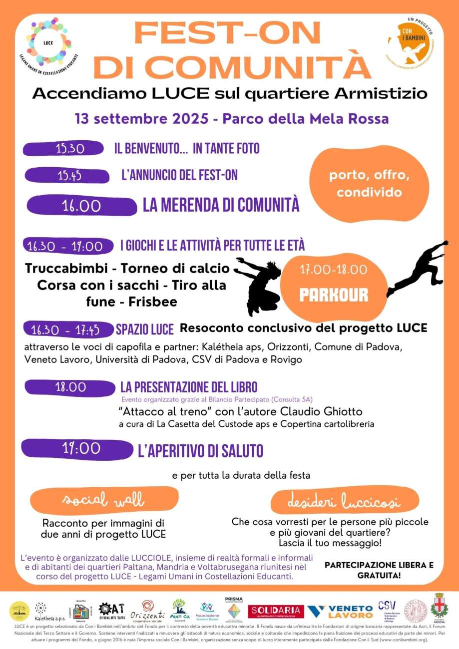 Dalle 16.30 alle 19.00 il parco si trasformerà in un grande spazio di gioco e attività: truccabimbi, torneo di calcio, corsa con i sacchi, tiro alla fune e frisbee, per coinvolgere piccoli e grandi. In parallelo, tra le 16.30 e le 17.45, è previsto lo Spazio LUCE, con il resoconto del progetto attraverso le voci dei partner: Kalétheia APS, Orizzonti, Comune di Padova, Veneto Lavoro, Università di Padova e CSV di Padova e Rovigo.