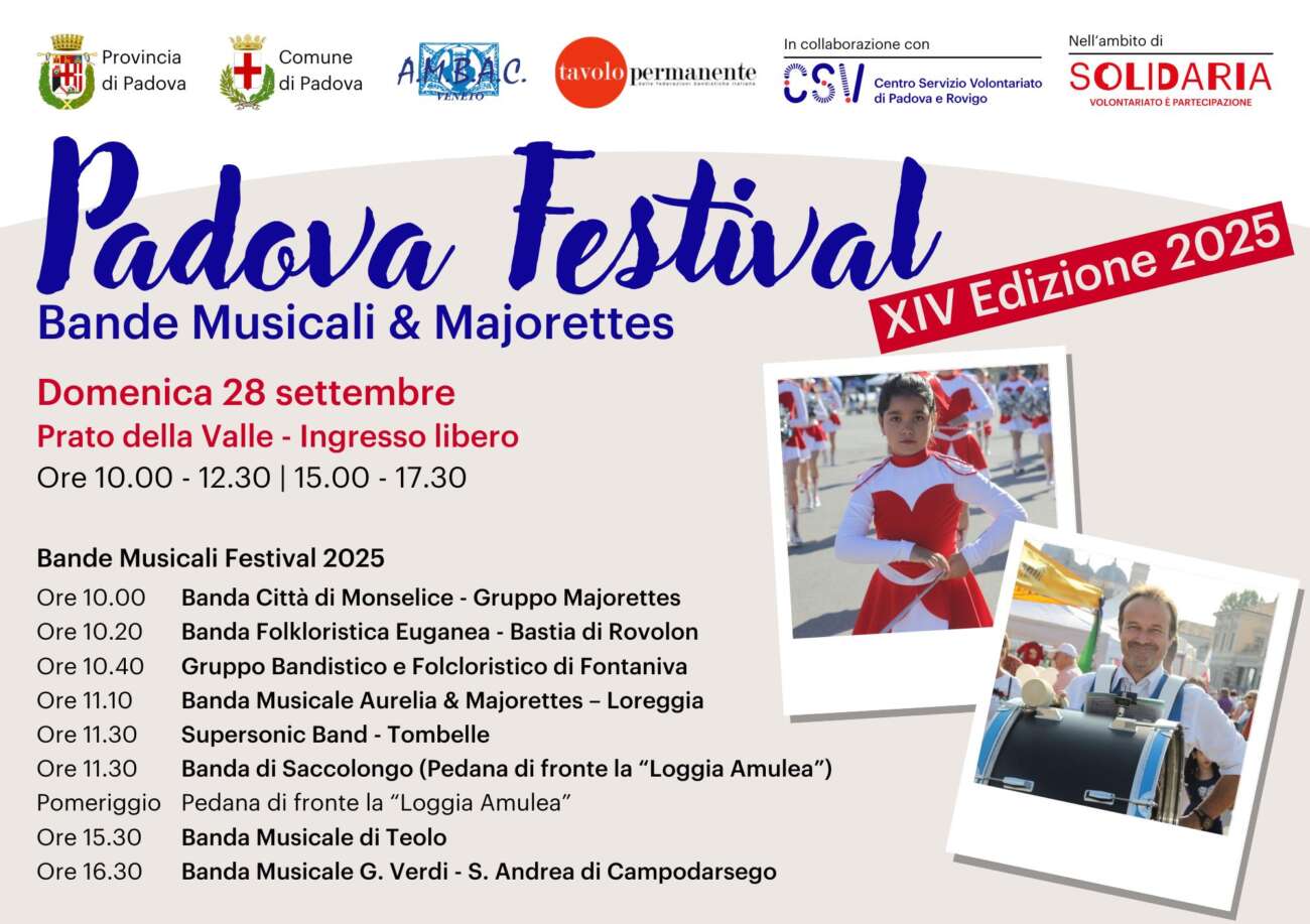 Il Festival Padova delle bande musicali & majorettes, organizzato dall’Ambac con il patrocinio di Comune e Provincia e giunto alla sua 14esima edizione, mira a promuovere la tradizione musicale bandistica e le attività delle majorettes, che includono anche discipline sportive come il baton twirling e il cheerleading. La giornata prevede sfilate in Prato della Valle al mattino e concerti nel pomeriggio, con la partecipazione di diverse bande e gruppi majorettes del territorio. Un momento significativo sarà l’esecuzione congiunta dell’Inno del Volontariato Europeo, dedicato alla memoria di Anna Donegà del CSV di Padova e Rovigo.