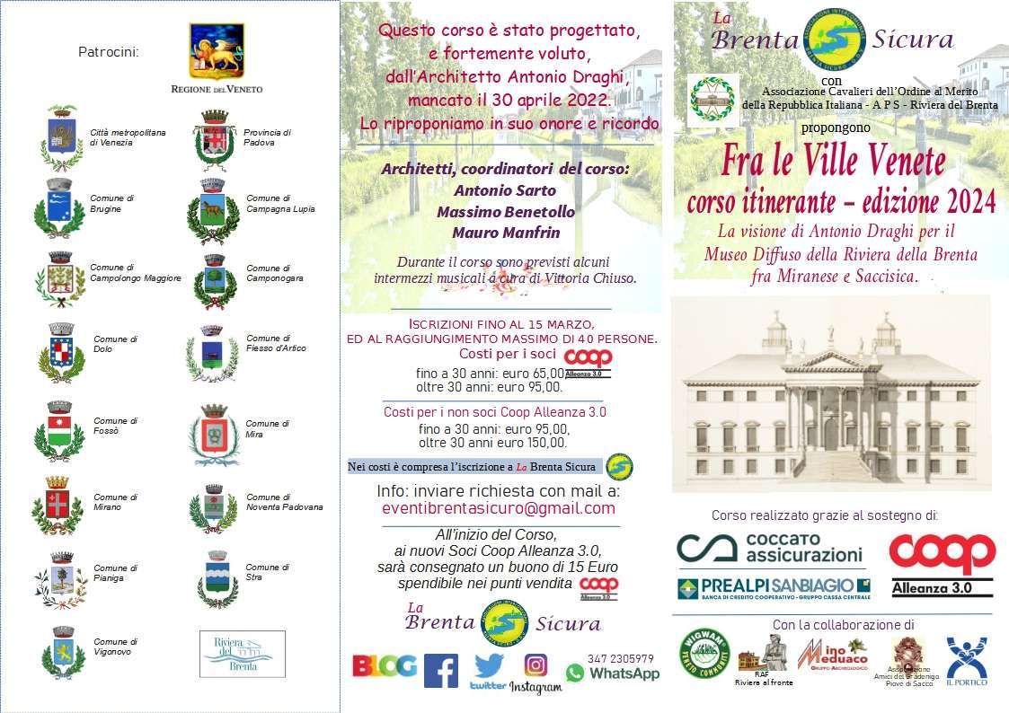 Il corso itinerante “Fra le Ville Venete” è organizzato dall’Associazione La Brenta Sicura, con il prezioso supporto scientifico degli Architetti Massimo Benetollo, Mauro Manfrin, Antonio Sarto. Saranno proposti nuovi itinerari per la conoscenza delle ville Venete, della Riviera del Brenta ma anche nei vicini territori del Miranese e della Saccisica, come era stato pensato dall’architetto Antonio Draghi nella sua lungimirante visione di Museo Diffuso, ovvero di valorizzazione di un territorio unico: un gran numero di ville Venete e paesaggi che si affacciano sulle storiche acqua del Naviglio del Brenta.
