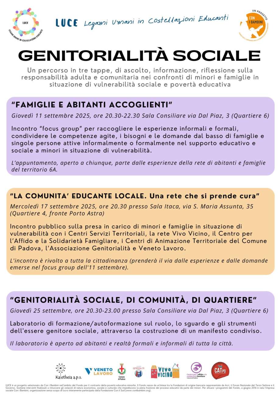 Grazie alla collaborazione tra il progetto LUCE, i Servizi Sociali del Comune di Padova, l’Associazione Genitorialità e Veneto Lavoro, è stato quindi ideato un percorso in tre tappe, che intreccia esperienze, strumenti e reti attive nel territorio per rafforzare il ruolo del genitore sociale: una figura capace di agire con consapevolezza e responsabilità per sostenere bambini e ragazzi, insieme alle loro famiglie, nei momenti di maggiore fragilità.