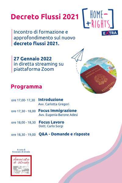 Il 27 Gennaio dalle ore 17,00 si svolgerà in diretta streaming su Zoom il primo di questi eventi Extra: un incontro di formazione e approfondimento sul nuovo decreto flussi, pensato per avvocati, praticanti, operatori sociali e volontari.