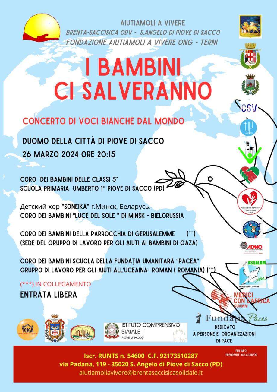 L’Associazione Aiutiamoli a Vivere Brenta-Saccisica, insieme alla Fondazione Aiutiamoli a Vivere Ong – Nazionale e ad altre associazioni territoriali, annuncia il concerto di voci bianche dal mondo “I bambini ci salveranno”.