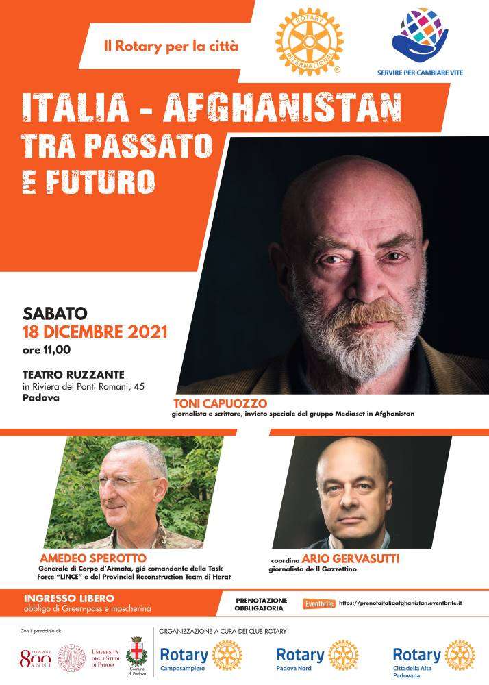 Club Rotary Padova Nord, Camposampiero e Cittadella Alta Padovana organizzano nell’ambito del progetto “Il Rotary per la città” l’evento pubblico “Italia-Afghanistan tra passato e futuro”. L’incontro che vedrà protagonisti due tra i massimi esperti della situazione afghana: il giornalista Toni Capuozzo e il generale Amedeo Sperotto, moderati dal giornalista Ario Gervasutti, si svolgerà SABATO 18 DICEMBRE con inizio alle ore 11 al Teatro Ruzante in Riviera dei Ponti Romani, a Padova, con ingresso gratuito.