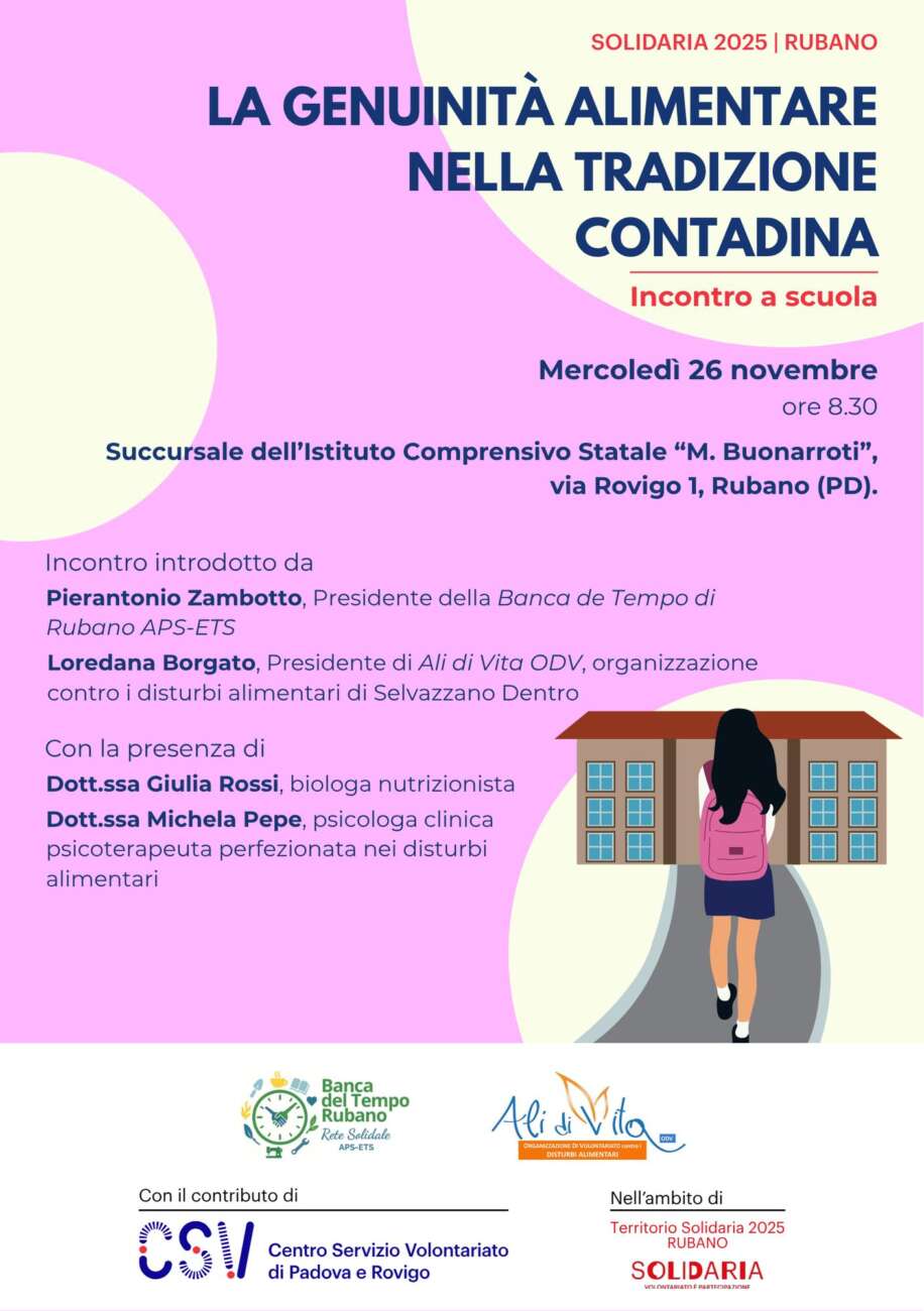 Organizzato dalla Banca del Tempo di Rubano e da Ali di Vita, con il contributo del CSV di Padova e Rovigo, nell’ambito di Solidaria 2025, l’incontro vedrà coinvolti gli studenti e le studentesse della succursale dell’Istituto Comprensivo Statale “M. Buonarroti”, a Rubano (PD).