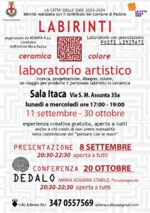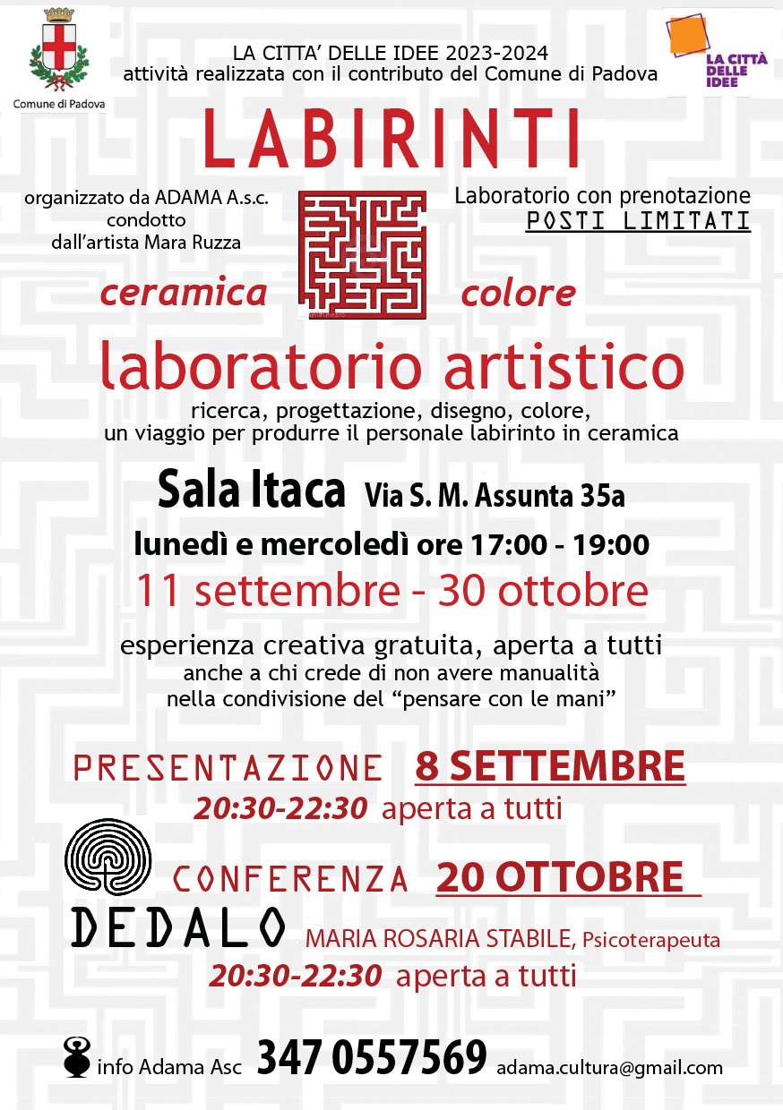 Realizzato con il contributo del Comune di Padova nell’ambito del progetto “La città delle Idee”, l’Associazione Culturale Adama propone nel periodo settembre-ottobre 2023 il laboratorio artistico “Labirinti”.