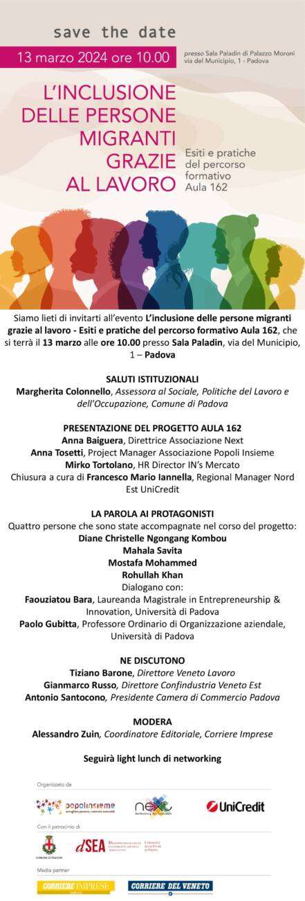 L’evento, a conclusione del progetto “Percorso formativo Aula 162”, nasce dall’idea di riportare l’attenzione, nel processo di inserimento lavorativo delle persone vulnerabili con focus sui migranti, verso il dialogo e la connessione con il tessuto produttivo ed economico locale, rispondendo tempestivamente e in modo mirato alle esigenze del mercato del lavoro.