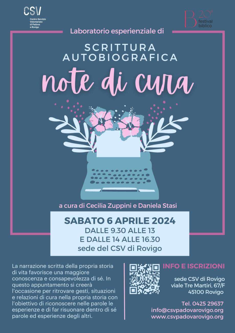 Il laboratorio, organizzato dal CSV di Padova e Rovigo in collaborazione con il comitato organizzatore del Festival Biblico di Rovigo, si terrà sabato 6 aprile dalle 9.30 alle 13 e dalle 14 alle 16.30 nella sede del CSV di Rovigo in viale Tre Martiri 67/F (parcheggio interno ad accesso libero di fronte all’ingresso, fino a esaurimento posti).