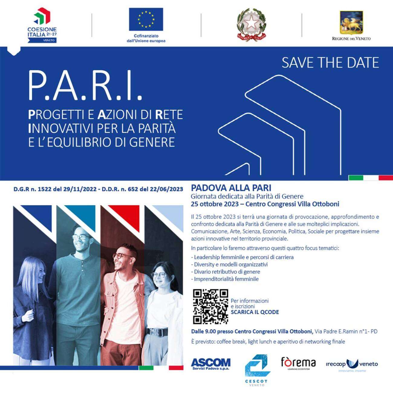 Mercoledì 25 ottobre ci sarà l’evento di lancio dei 4 progetti finanziati nella Provincia di Padova a valere sulla Dgr 1522/22 P.A.R.I. Progetti e Azioni di Rete Innovativi per la parità e l’equilibrio di genere