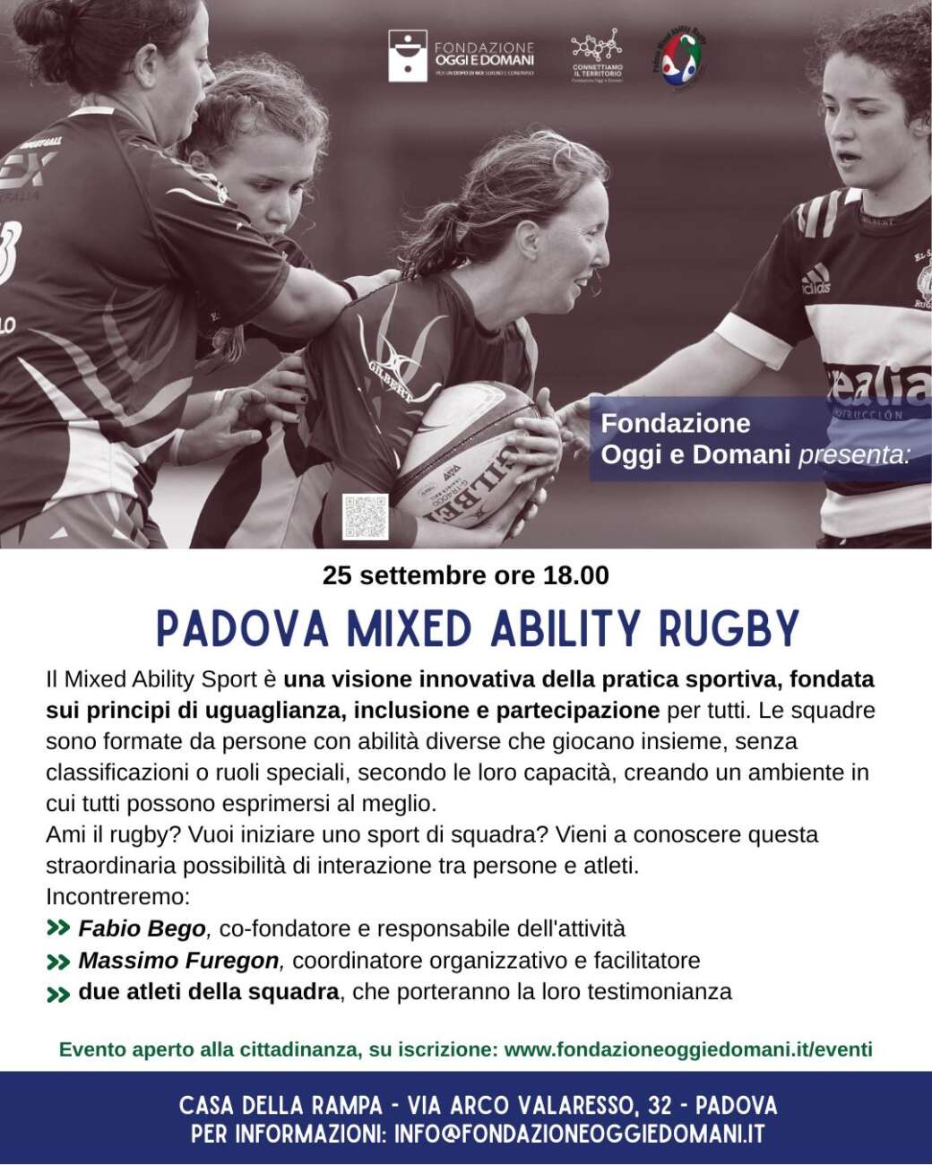 Il prossimo appuntamento sarà dedicato a uno straordinario esempio di sport inclusivo: il Padova Mixed Ability Rugby, in programma giovedì 25 settembre, dalle 18.00 alle 19.30, presso la Casa della Rampa a Padova.