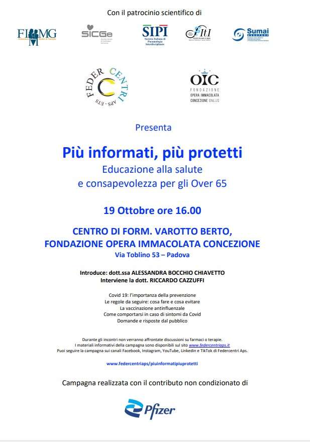 L’incontro “Più informati, più protetti. Educazione alla salute e consapevolezza per gli Over 65” si terrà giovedì 19 ottobre, alle ore 16, presso il Centro di From. Varotto Berto, Fondazione Opera Immacolata Concezione, in via Toblino 53 (Padova).