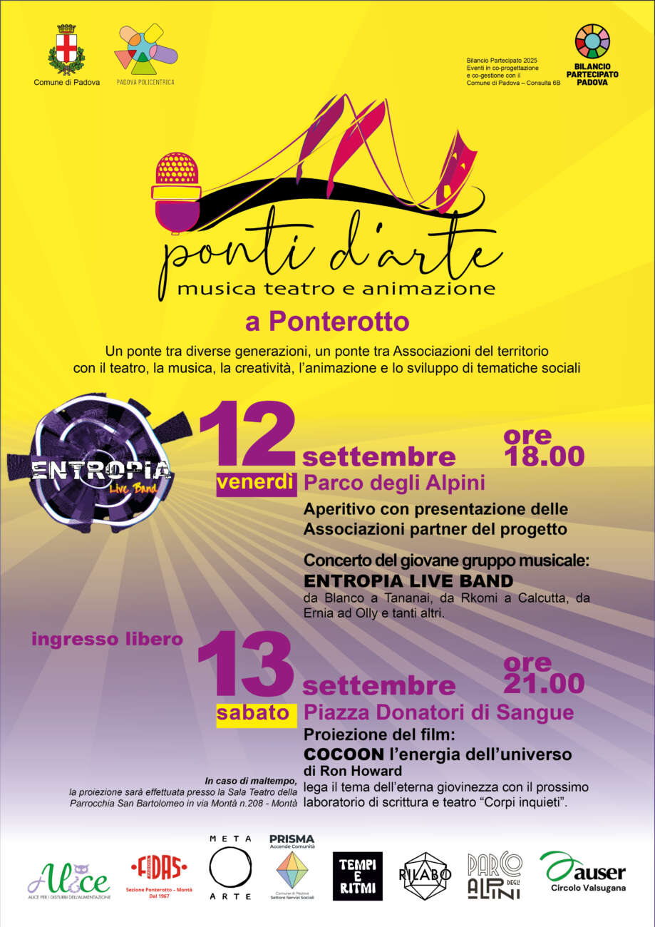 Ponti d’Arte è sostenuto dal Bilancio Partecipato 2025 del Comune di Padova e si realizza grazie alla collaborazione di diverse associazioni, tra cui Alice per l’Epilessia dell’Adolescenza, FIDAS Sezione Ponterotto-Montà, MetaArte, Prisma Accende Comunità, Tempi e Ritmi, Rivabor, Parco degli Alpini e Auser Circolo Valsugana.