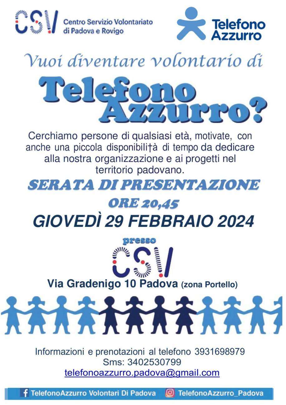 Fondazione SOS Telefono Azzurro ETS cerca volontar* per sostenere i progetti e le proprie attività sul territorio di Padova. Per questo, organizza una serata di presentazione giovedì 29 febbraio 2024 alle ore 20.45, presso CSV di Padova in via Gradenigo 10.