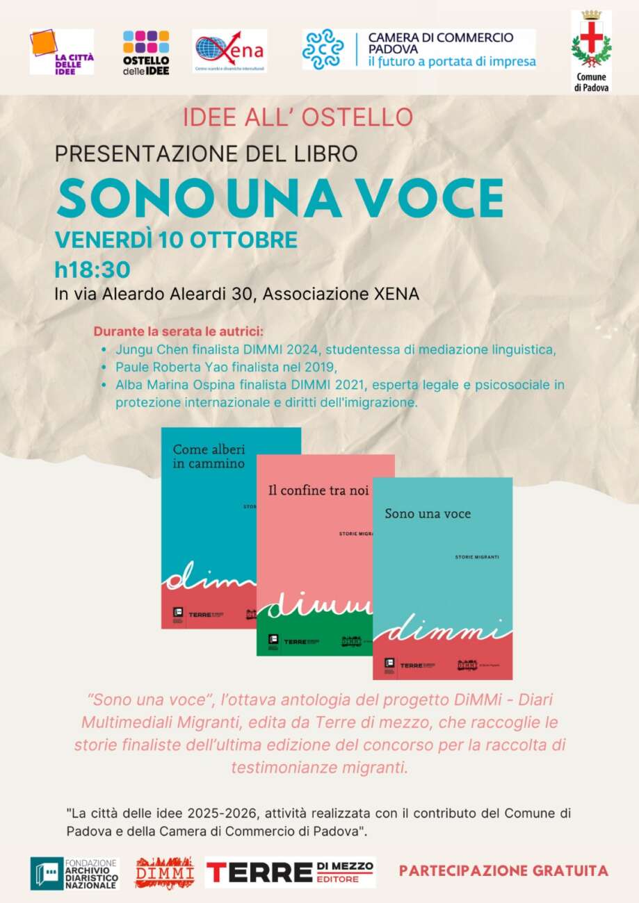 Il 10 ottobre 2025 alle ore 18.30 presso l’associazione Xena a Padova verrà presentata “Sono una voce”, l’ottava antologia del progetto DiMMi – Diari Multimediali Migranti, edita da Terre di mezzo, che raccoglie le storie finaliste dell’ultima edizione del concorso per la raccolta di testimonianze migranti.