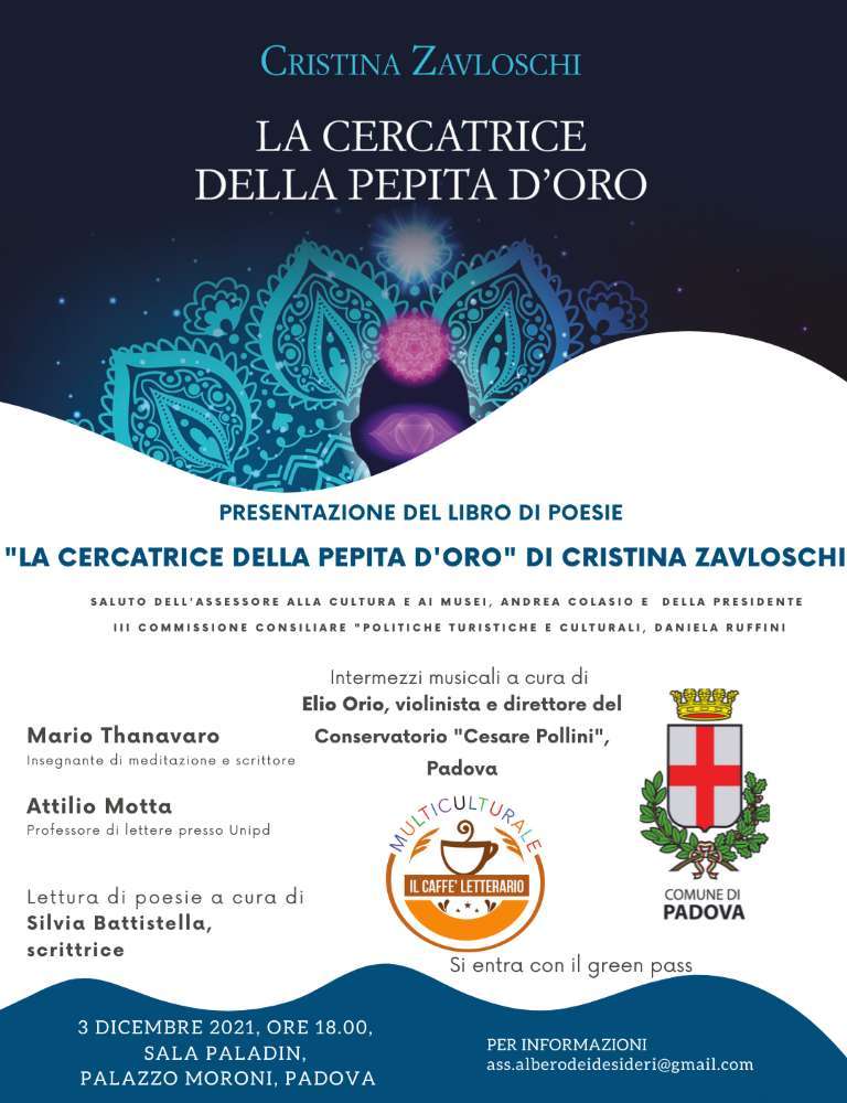 Venerdì 3 dicembre, ore 18.00, in Sala Paladin, Palazzo Moroni, si terrà la presentazione del libro di poesie “La cercatrice della pepita d’oro” della scrittrice Cristina Zavloschi.