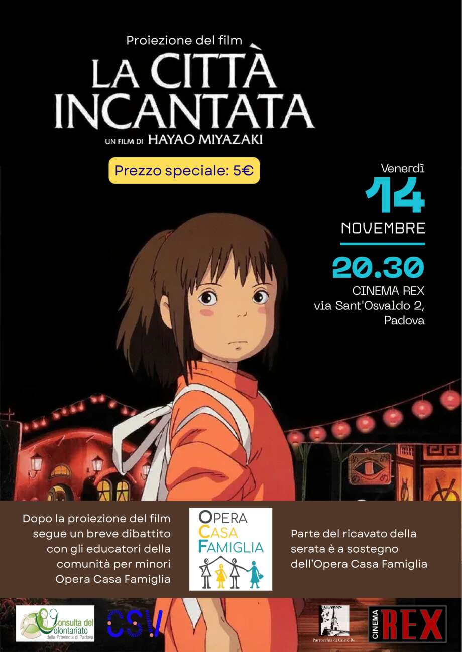 La Parrocchia di Cristo Re invita tutti gli amanti del cinema d’autore a partecipare a una serata speciale dedicata alla magia dell’animazione giapponese e alla solidarietà. Venerdì 14 novembre, alle 20:30, presso il Cinema Rex di via Sant’Osvaldo 2 a Padova, verrà proiettato il celebre film di Hayao Miyazaki, La città incantata, capolavoro dello Studio Ghibli vincitore dell’Oscar come miglior film d’animazione.