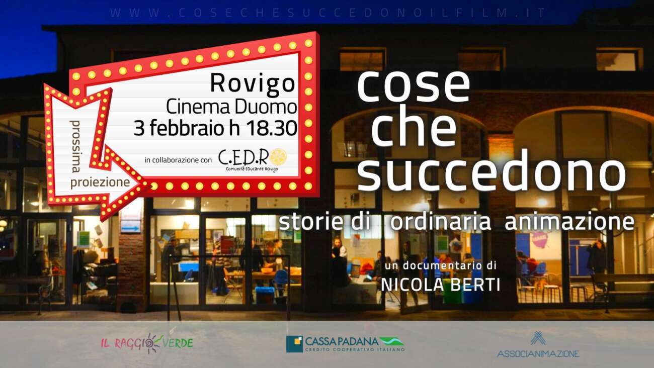 Giovedì 3 febbraio alle ore 18.30 si terrà presso il Cinema Duomo di Rovigo proiezione del documentario sull’animazione Cose che succedono – storie di ordinaria animazione realizzato da Il Raggio Verde con Associanimazione e la regia di Nicola Berti.