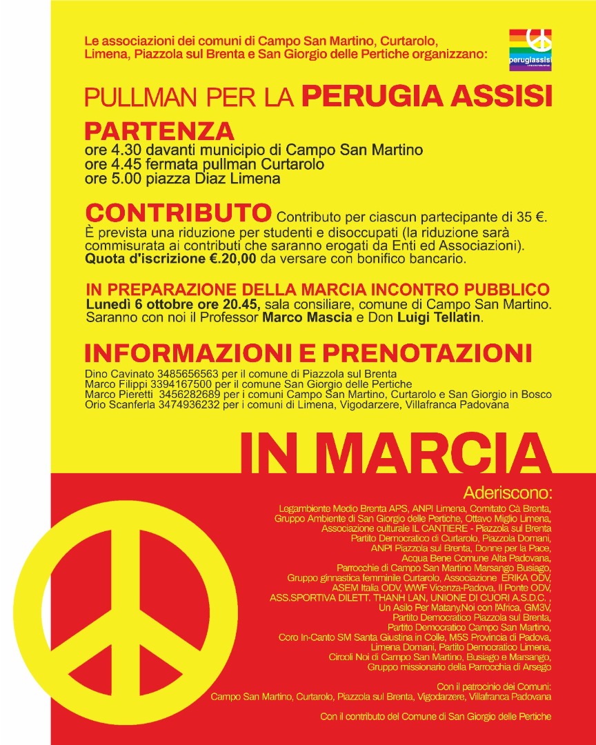 Legambiente Medio Brenta aps, assieme a tante altre realtà associative del territorio del medio Brenta, ha organizzato un pullman per partecipare alla marcia Perugia Assisi per la pace e la fraternità di domenica 12 ottobre 2025.