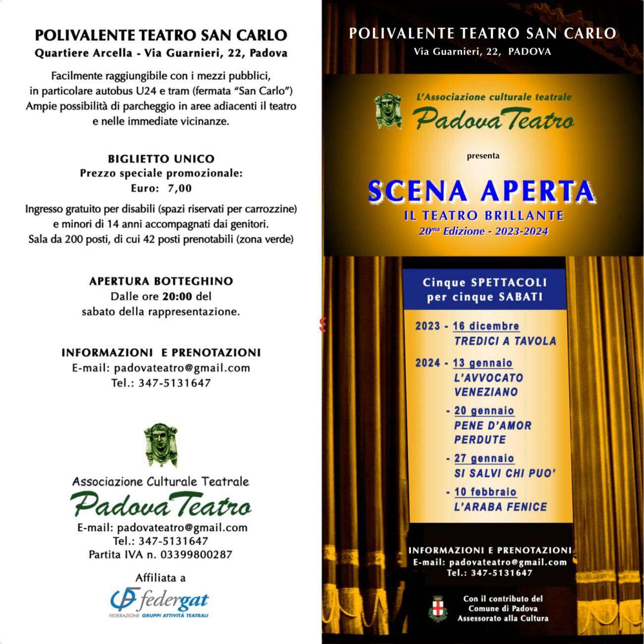 Il progetto, sostenuto dall’Assessorato alla Cultura del Comune di Padova, si sviluppa attraverso cinque affascinanti spettacoli, ognuno in una serata di sabato fra dicembre 2023 e febbraio 2024. Ingresso con biglietto unico di €7,00.