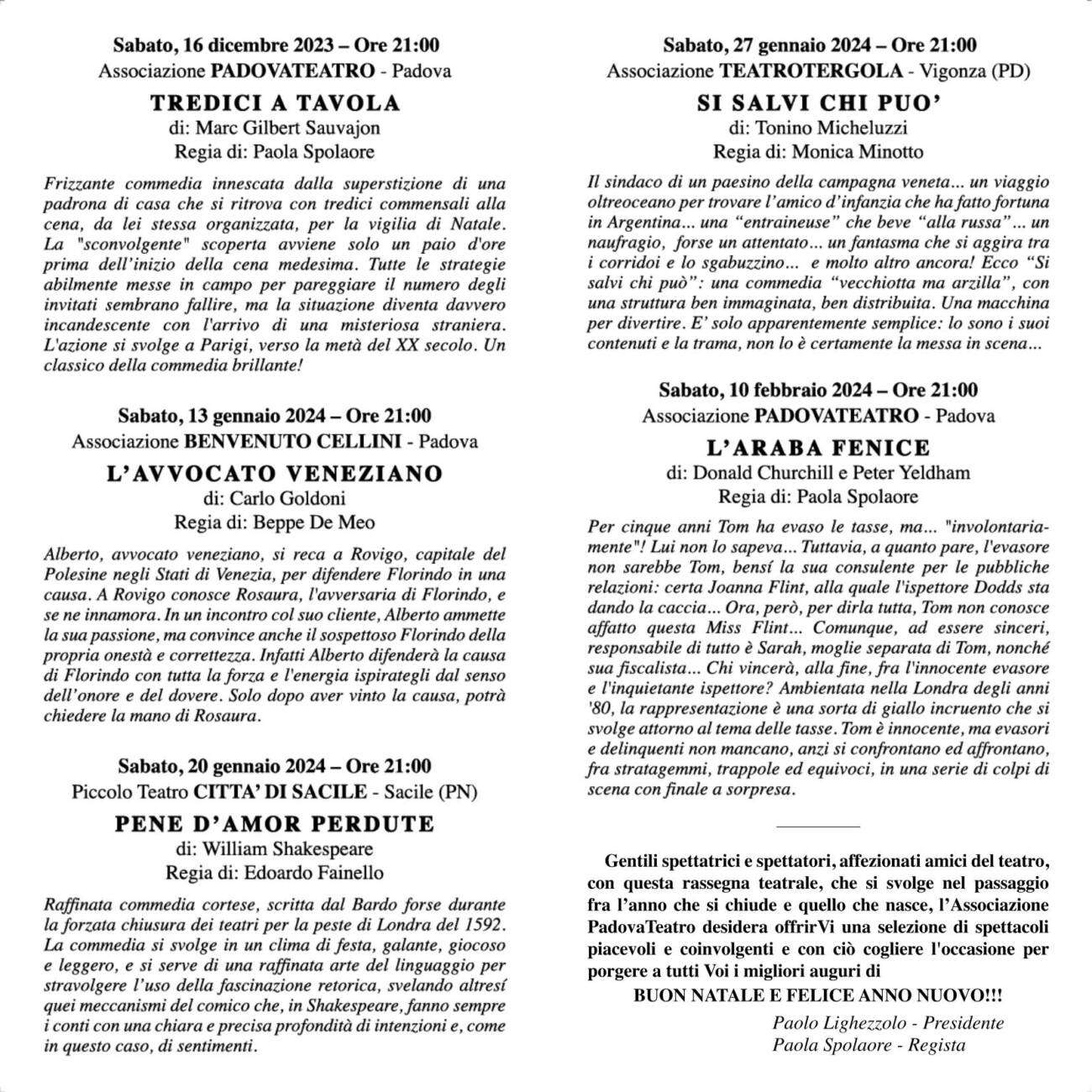 L’apertura avviene il 16 dicembre 2023 con “Tredici a tavola” di Marc Gilbert Sauvajon a cura dell’Associazione PadovaTeatro.
