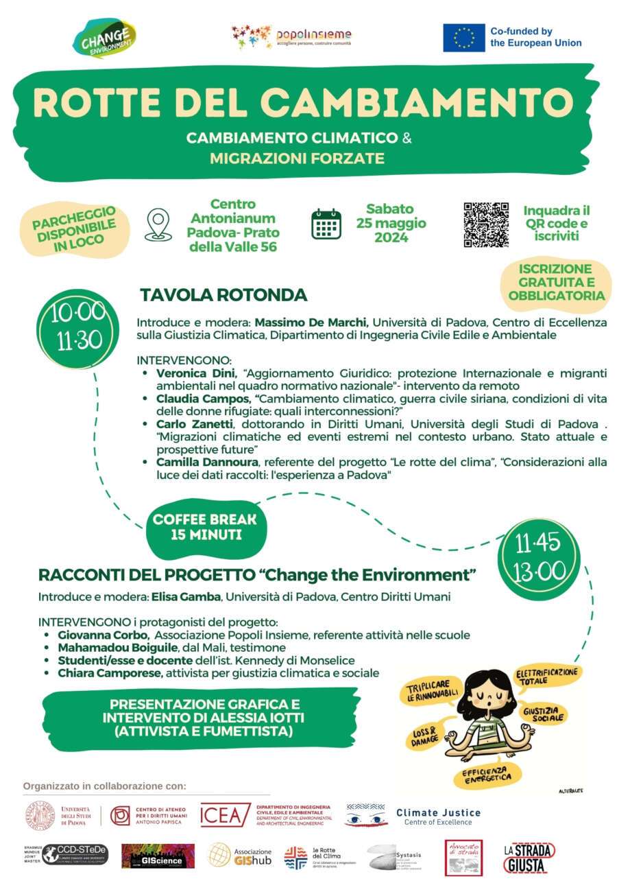 Evento a conclusione del progetto “Change the environment” promosso dal Jesuit Refugee Service Europe – JRS, di cui Popoli Insieme è partner per l’Italia, e realizzato in collaborazione con: Dipartimento di Ingegneria Civile Edile e Ambientale dell’Università di Padova, Centro d’Ateneo per i Diritti Umani “A. Papisca” dell’Università di Padova, Corso di Laurea Magistrale CCD-STeDe, Master di II livello in GIScience e SPR, Centre of Excellence on Climate Justice, Associazione GIShub ODV, Associazione Systasis – Centro Studi per la prevenzione e la gestione dei conflitti ambientali, Associazione Avvocato di Strada ODV e Associazione La strada giusta.