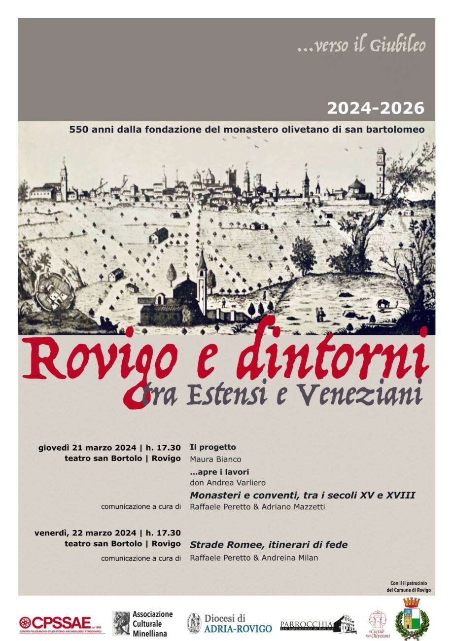 L’Associazione Il Cortile degli Olivetani, il Cpssae (Centro Polesano Studi Storici Archeologi ed Etnografici) e la parrocchia di San Bartolomeo Apostolo, promuovono una serie di iniziative per commemorare i 550 anni dall’annessione del monastero di San Bartolomeo alla congregazione degli Olivetani
