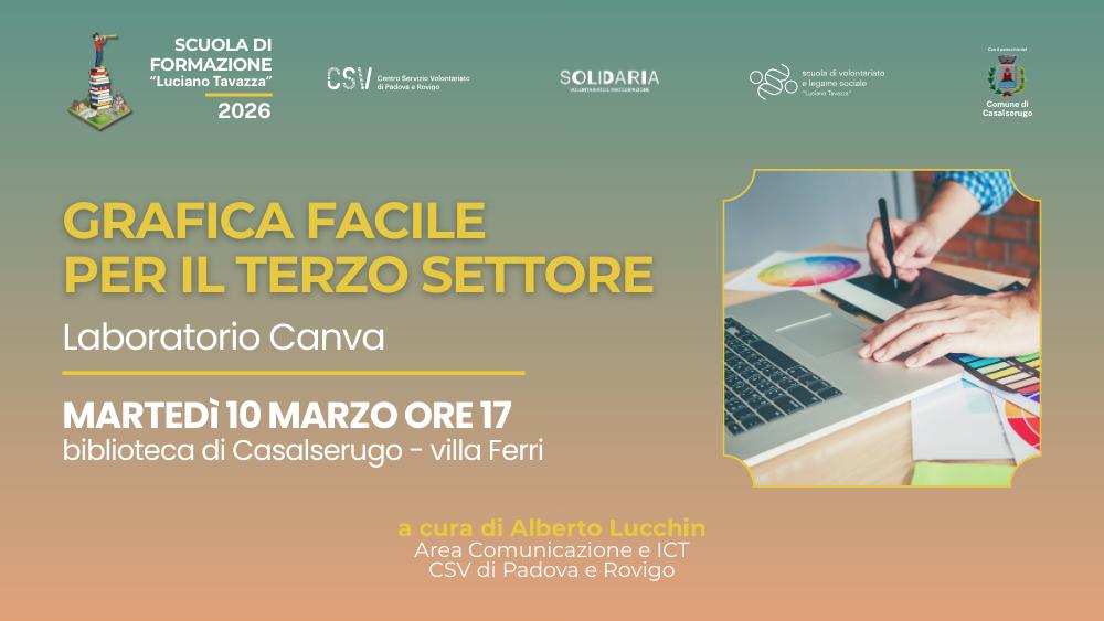 Martedì 10 marzo alle ore 17:00, presso la Biblioteca comunale di Casalserugo (Villa Ferri detta Castel Ser Ugo in via Roma, 14), si terrà l’incontro “Grafica facile per il Terzo settore: laboratorio Canva”.