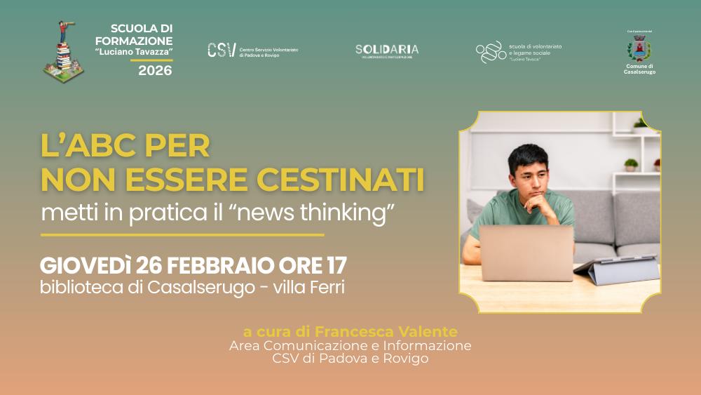 Giovedì 26 febbraio, alle ore 17:00, presso la Biblioteca comunale di Casalserugo (Villa Ferri detta Castel Ser Ugo in via Roma, 14), si terrà l’incontro “L’ABC per non essere cestinati: metti in pratica il news thinking”.