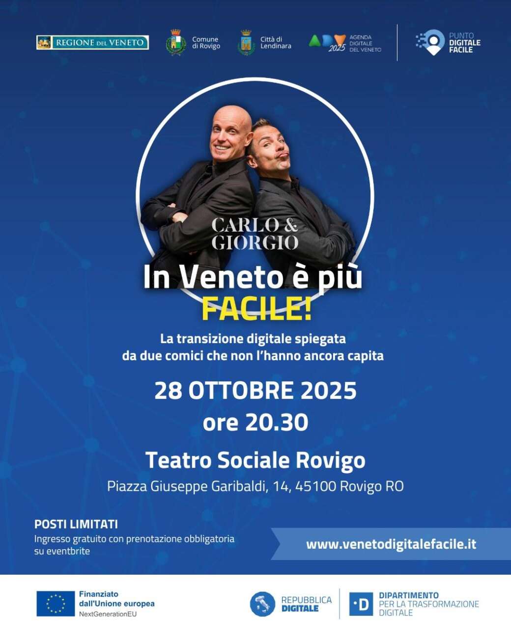 Spettacolo “In Veneto è più FACILE! – La transizione digitale spiegata da due comici che non l’hanno ancora capita”, con il celebre duo Carlo & Giorgio, in programma martedì 28 ottobre 2025 alle ore 20.30 presso il Teatro Sociale di Rovigo in Piazza Garibaldi.