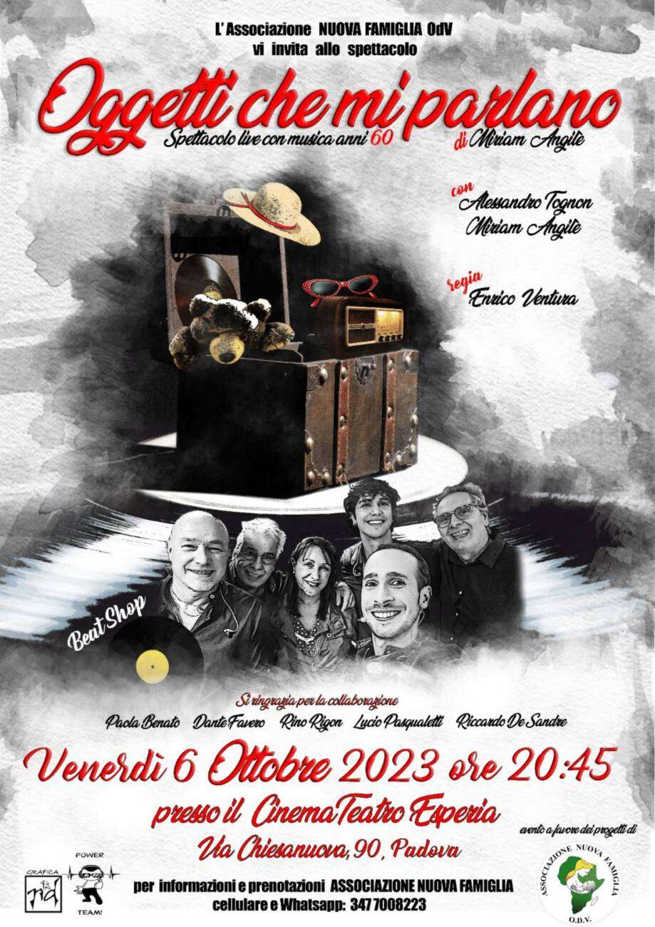 L’evento, che si terrà venerdì 6 ottobre dalle ore 20:45 presso il Cinema Teatro Esperia a Padova, consiste in uno spettacolo live di Miriam Angilè con musica e canzoni anni ’60 e ’70 interpretate e proposte dal gruppo Beat Shop.