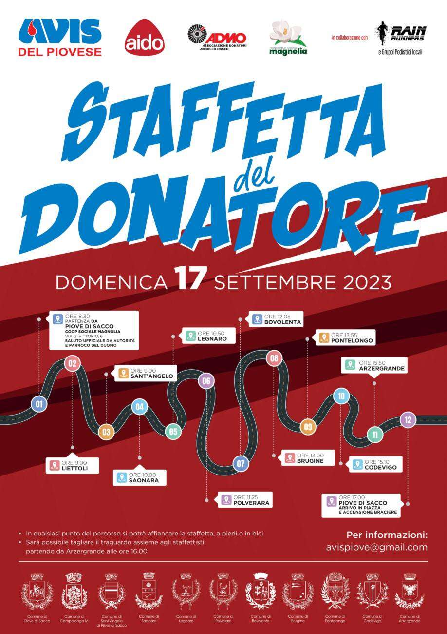 In concomitanza con la Fiera delle Associazioni di Piove di Sacco, Avis del Piovese, Aido, Admo, cooperativa sociale Magnolia e Rain runners Asd daranno vita alla “Staffetta del donatore”, una competizione riservata a podisti e ciclisti di ben 60 chilometri in programma nella giornata mattinata di domenica 17 settembre.