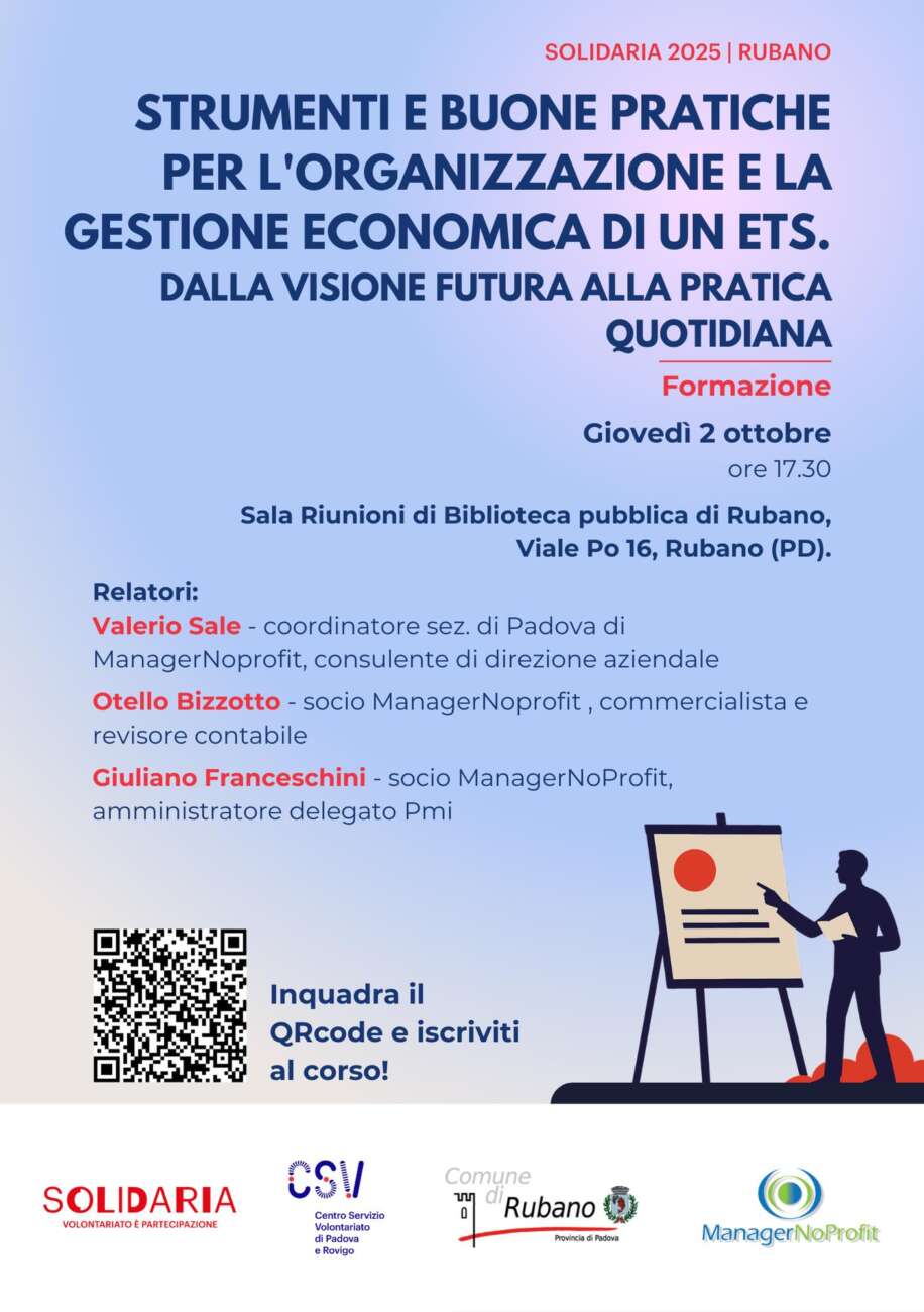 Giovedì 2 ottobre, alle 17.30, presso la Sala Riunioni della Biblioteca pubblica di Rubano (Viale Po 16), si terrà un incontro formativo dedicato a chi opera nel mondo del Terzo Settore. L’appuntamento, promosso nell’ambito di Solidaria 2025 e realizzato in collaborazione con il Centro Servizio Volontariato di Padova e Rovigo e il Comune di Rubano, affronterà il tema cruciale della gestione organizzativa ed economica degli Enti del Terzo Settore (ETS), con un approccio che unisce visione strategica e pratiche quotidiane.